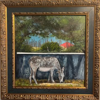 a pregnant donkey feeding under a shady canopy, a ferry captain atop deck, beach goers chatting leisurely.